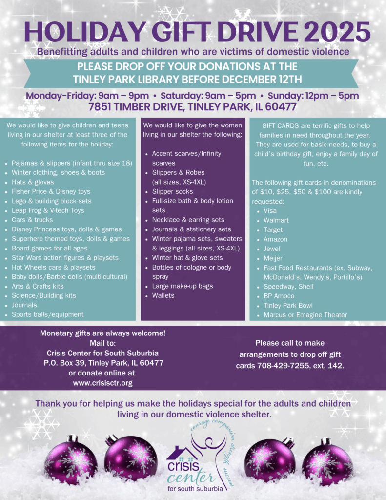 In partnership with the Crisis Center, the Tinley Park Public Library will set collection boxes for us just inside their front doors under the donor wall until December 12th.